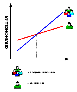 Хакеры такие же люди, как и мы с вами. Только их энергия направлена на несколько иные поступки. Вы несомненно сможете обнаружить абсолютное большинство атак, реализуемых злоумышленниками с такой же или еще ниже квалификацией, что и у вас. Но как только в дело вступит квалифицированный "хакер-эксперт", то считайте, что вам не повезло. На рисунке показана зависимость вероятности обнаружения злоумышленника от его квалификации и квалификации персонала, отвечающего за обеспечение информационной безопасности. Если квалификация персонала выше, то в абсолютном большинстве случаев он имеет все предпосылки для обнаружения злоумышленников. Если квалификация персонала ниже, то обнаружить злоумышленника очень трудно или зачастую просто невозможно. В том случае, если квалификация администратора безопасности адекватна квалификации злоумышленника, то все зависит от того, кто первым сделает ошибку.